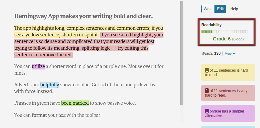 Bad name for a wonderful app. Hemingway was a famous writer with a great style, but his spelling was so awful that he gave his editor a lot of work to correct his manuscripts. Nevertheless, what was good about Hemingway’s work was that he never said anything in a complicated way when it could be said simply. This should also be your aim: write intelligent, intelligible, clear English. Intelligent doesn’t mean long words from the dictionary. Don’t use difficult words where you can say the same with a simple one-syllable word.