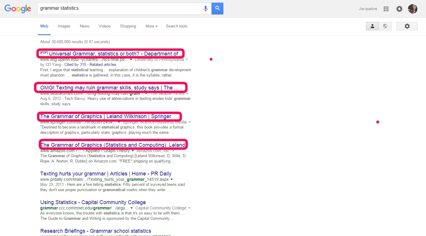 Here is an example: I’ve typed grammar + statistics. (not a very specific keyword.)